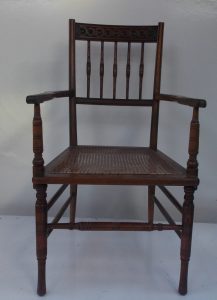 Antique Wooden Armchair With Cane Seat And Rustic Carved Design